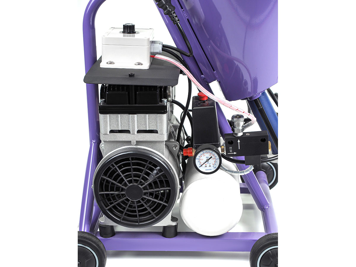 На установке смонтировано реле давления, которое позволяет оператору осуществлять запуск установки аналогично запуску окрасочного аппарата, то есть при открытии крана подачи воздуха автоматически запускается и привод, и компрессор. При закрытии крана воздуха установка полностью отключается.