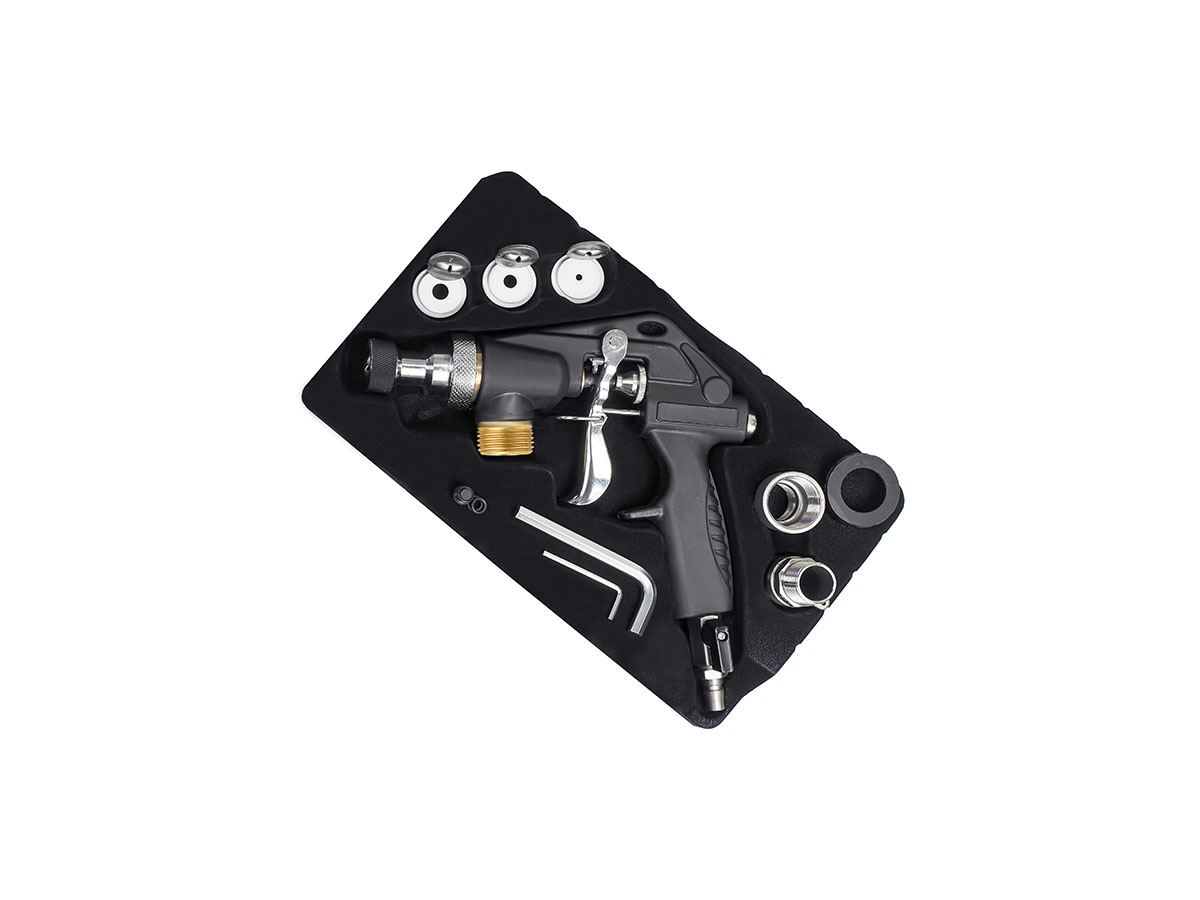 На конце двухканального распылителя установлены специальные форсунки, при прохождении через которые под давлением, происходит превращение жидкости в мелкодисперсную аэрозоль. Благодаря воздушному компрессору, распыляющему материал, покрытие равномерно ложиться на обрабатываемую поверхность.